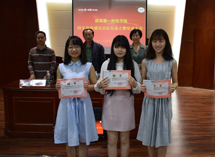 教师通讯员代表、学生工作处办公室主任滕远,学生记者代表、学生新闻中心主任周雅婷分别上台发言,表达了做好校园新闻宣传工作的信心和决心。