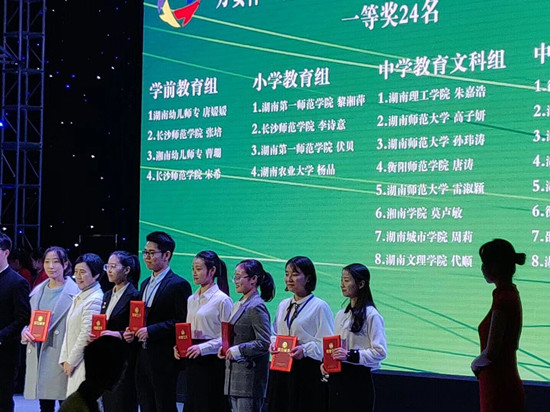 11月10日,湖南省普通高等学校第四届师范生教学技能竞赛在衡阳师范学院举行,来自省内24所高校的142名选手参加比赛。比赛分学前教育、小学教育和中学教育三组。我校选送了10名学生分别参加了小学教育组和学前教育组的比赛,获得一等奖2项、二等奖3项、三等奖2项,其中小学组获奖总数与一等奖个数居全省高校首位,同时获得优秀组织奖。