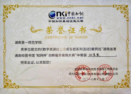 12月27日,湖南省普通高校图书馆“知网杯”创新服务案例大赛决赛在长沙举行。我校图书馆提交的《数字资源线上有奖答题系列活动》案例荣获优秀奖。