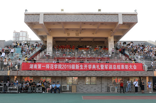 军训成果展示赢得了阵阵掌声和喝彩。在城南书院校区,中招新生以励志手语操《国家》表达了对祖国母亲的深厚情感。“有国才有家,我爱我国家......”,他们的声音响彻会场。在东方红校区,创新方阵的展演中,新生战士们迅速变化队形,拼出了一幅美丽的中国地图和喜庆的“中国70”的字样,他们挥舞着小红旗,合唱《我和我的祖国》,歌声缓缓传扬,以此致敬新中国70周年华诞,祝愿伟大的祖国母亲繁荣昌盛、生日快乐。校园文化方阵先以倒计时、校史校训校风的队形,展现了一师“千年学府,百年师范”的悠久历史,随后大风大浪的动态展示和帆船变换的造型,表达了新生在初入大学时的迷茫困惑,拨开迷茫战胜困难的决心和勇气,以及对进入一师的欣喜之情。在最后的拳术方阵展示中,新生战士们一条口号一招拳术,身形变化中体现了少年风骨,声声呐喊里张扬着青春活力。