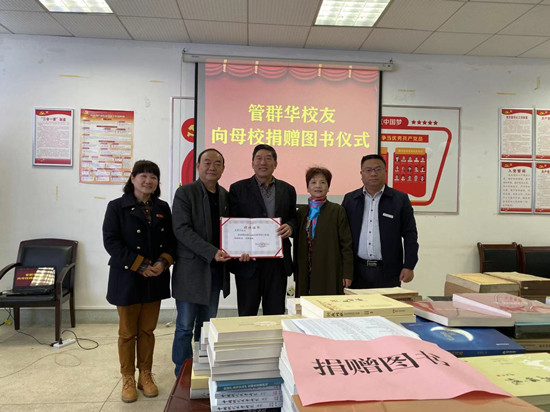 副校长刘鸿翔向管群华先生介绍了学校近年来的发展情况,并对他历年来给予母校的关心与支持表示感谢。管群华先生深情回忆自己从1974年进入一师,在这里学习、工作十年之久,对母校感情深厚,对学校的快速发展感到骄傲,希望能够为母校多做贡献。管群华先生此次为学校捐赠图书400余册,刘鸿翔代表学校向管群华先生颁发了捐赠证书。