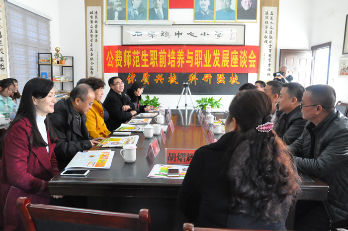 11月26日下午,我校在湘潭县石潭镇中心小学召开公费师范生职前培养与职业发展座谈会。我校党委书记彭小奇、校长童小娇及教务处、科研处、教育科学学院负责人和前来参加“小学教师教育协调创新中心”成立大会的专家、湘潭市、县教育局相关负责人以及石潭镇中心学校、石潭镇中心小学教师代表一起,共同探讨公费师范生职前培养与职业发展问题。