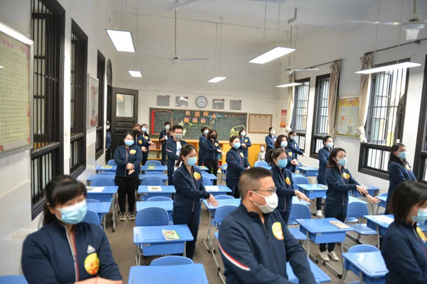 该校演练过程中,由班主任扮演学生,老师们统一着装、严肃认真,有条不紊地完成了整个演练流程,演练分为六个部分。一是入校演练。该校实行错峰上学,孩子们在相应的时间内有序在校门外排队,相互间隔保持至少一米以上的距离。对校门口进行全面消毒后,值周行政及保安到岗到位,引导“学生”入校,由值周教师进行热成像体温测试。检测中一旦发现学生体温异常,检测人员立即引导该学生前往应急隔离点,由身着防护服的医护人员带往隔离室进行进一步检查。二是应急演练。一旦在任何环节中有任何突发状况,学校将立即启动应急预案。学校相关疫情负责人上报给上级行政主管部门,同时卫生老师上报情况给社区卫生院及区疾控中心相关负责人。整个处置流程包括报告、隔离、送医、上报、消毒、评估六个环节。三是课堂活动演练。班主任在教室门口进行学生入校后的第二次体温检测,副班主任负责登记。体温正常者排队进入教室。学生实行单人单桌且每张课桌间保持一定距离。在班级课堂演练中,老师们模拟了学生缺勤、身体不适、情绪失常等情况,并迅速做出了相应的处理措施。四是课间活动演练。为确保孩子们下课活动时不聚集不扎堆,学校安排了值周行政、教师及班主任在走廊上进行疏导、管理,提醒孩子们分年级、分区域分散活动。同时,该校还根据实际情况,在大课间安排了锻炼时间,由老师带领孩子们在座位旁学做防疫律动操,进行适量的身体舒展。五是就餐演练。整个就餐演练过程,包括运餐、洗手、取餐、就餐、餐后消毒等环节。六是放学演练。学生放学回家皆实行分年级错峰放学,避免校门口人员聚集。值周行政、值周教师、保安及家长护学志愿者分工合作,引导学生从不同的通道有序离开校园。