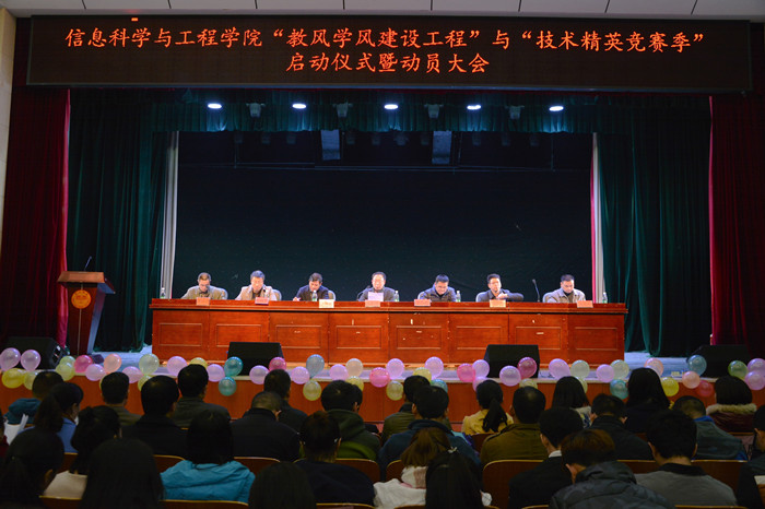 为进一步培育优良学风,营造积极向上的“学”与“教”的环境,实现学院培养“技术精英”的办学目标,11月8日下午,信息科学与工程学院“教风学风建设工程”与“技术精英竞赛季”启动仪式暨动员大会在东方红校区科技楼实验剧场隆重举行。学生工作处处长陈志武、教务处处长李茂平、团委书记赵小群等应邀出席,学院党政领导、全体教职员工及400余名学生代表参加了会议。大会由学院党总支副书记罗祥云主持。