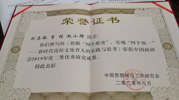 近日,中国思想政治工作研究会公布了2019年度优秀研究成果获奖名单,我校党委副书记刘志敏主持申报的《把握“四个维度”,实现“四个统一”——新时代高校文化育人的实践与思考》获评二类研究成果。
