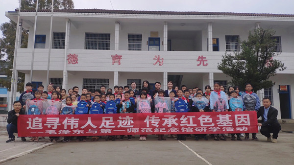 在文昌中学和郑家驿镇中学,纪念馆老师们分别从“一张地图立志向”“两本书中看世界”“多种方式强体魄”三个方面,讲述青年毛泽东在湖南第一师范立志、学习、体育锻炼的事迹。在随后的问答互动环节中,同学们争先恐后地举手,踊跃发言,讲述着他们对伟人的敬仰,抒发自己的志向。同学们和老师之间的精彩问答,一次次把气氛推向高潮。活动在邹磊、赵小玚两位老师深情的讲述《藏在衣柜里的父子情》《吃水不忘挖井人》这两个感人的红色故事中结束。同学们凝神静听,被深深吸引,留下了感动的眼泪。课后,馆长艾建玲代表纪念馆向郑家驿镇中学的71位建档贫困生赠送了书包、跳绳等物资。在常德市红色文博园,纪念馆老师们还为湖南文理学院资旅学院的党员干部上了一堂生动的党课。