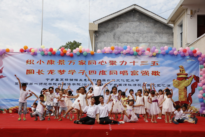首先映入眼帘的是舞台中间的对联:织小康景万家同心聚力十三五,圆长龙梦学子四度同唱富强歌。舞台上,我校外国语学院全体支教队员表演了广场舞《中国范》、舞蹈串烧《Fun Time》、合唱《最好的未来》,当地“三下乡”受教学生代表表演了跆拳道《太极一章》、少儿舞《拨浪鼓》、合唱《风吹麦浪》,村民代表精心准备了扇子舞《荷塘月色》、广场舞《共圆中国梦》、传统民艺三句半等节目。精彩纷呈的节目吸引了附近十里八乡200余名村民前来观看演出,现场十分热闹。