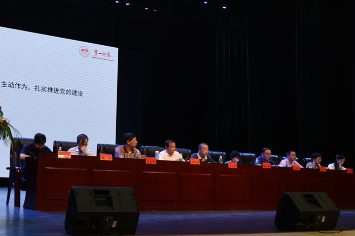 7月1日上午10时,我校在音乐剧场召开党建工作大会,学习贯彻习近平总书记系列重要讲话精神,总结2015年党建工作,安排部署下一阶段工作任务。校党委书记彭小奇作题为“以‘两学一做’为抓手,努力开创我校党建工作新局面”的党建工作报告,党委副书记刘志敏主持会议。全体校领导、在职教职工党员、离退休教职工党员代表、在校学生党员参加了会议。