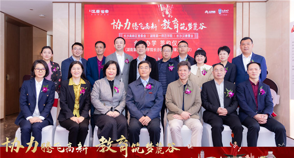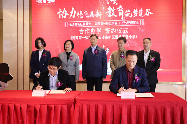 长沙高新区教育局、长沙汉唐置业有限公司、我校党委行政办公室、教务处、校友会及一、二附小相关负责人参加签约仪式。