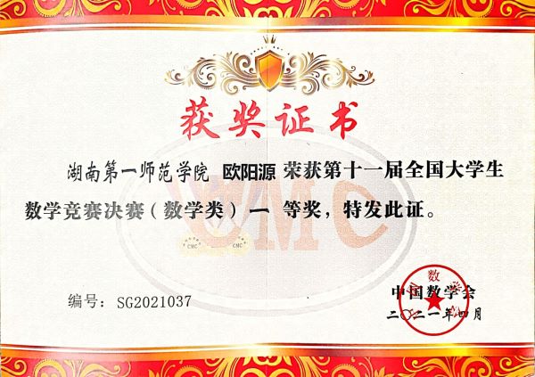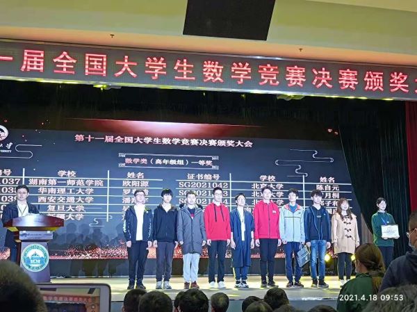 第十一届全国大学生数学竞赛初赛报名人数170787人,参赛高校849所。经过预赛选拔,共有来自全国31个赛区204所高校的605名学生入围决赛。欧阳源同学以湖南赛区数学组(B类)第一名的成绩获得全国决赛资格。决赛分为数学类高年级组、数学类低年级组和非数学类三个组别进行,最终共产生一等奖120名、二等奖187名、三等奖241名,其中数学类高年级组一等奖45名。
