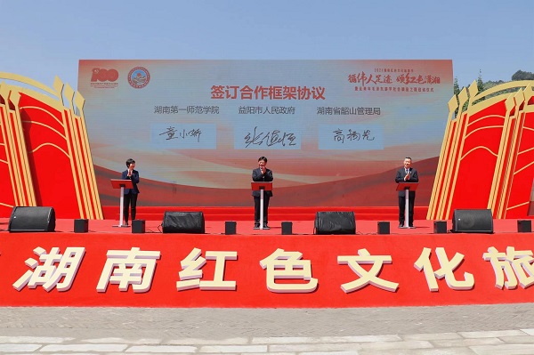 4月29日,由益阳市人民政府、湖南省文化和旅游厅、湖南省韶山管理局与我校共同主办的2021湖南红色文化旅游节——重走青年毛泽东游学社会调查之路启动仪式在安化县梅城镇文武庙古建筑群前坪举行。