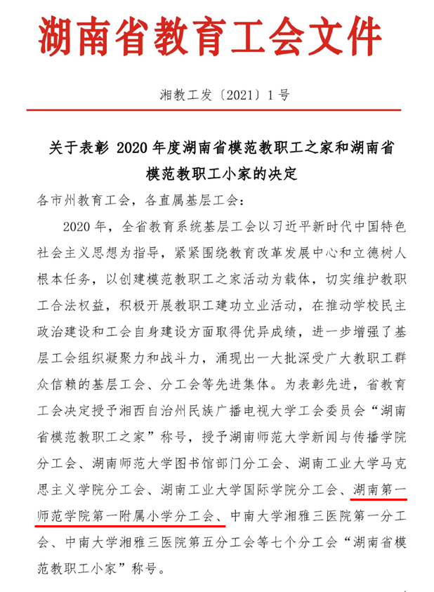 在湖南省教育工会2020年度湖南省模范教职工之家和湖南省模范教职工小家创建评选活动中,我校一附小分工会被授予“湖南省模范教职工小家”称号。