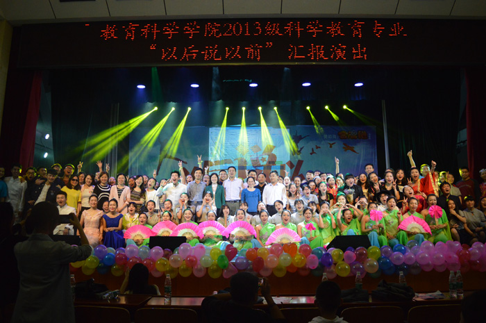19日晚,专业汇报演出于科技楼实验剧场举行。副校长刘宇、教育科学学院负责人蒋蓉、谭玉兰、王建平、张俭明及全体辅导员、科学教育教研室老师应邀出席,与到场学生约500余人一起观看了演出。演出以“以后说以前”的独特视角,呈现给大家一场视听盛宴,舞蹈或火辣劲爆、或温润蹁跹,歌曲或青春律动、或清丽婉转,小品相声或辛辣幽默、或真情演绎,还有巧妙穿插的微博互动、随机抽奖环节,无不体现出同学们的精巧用心。尤其,《学点知识去古代》精彩演绎了科教专业学生穿越时空,用科学知识赢得尊重和发展的故事,让大家在笑声中体味到科学知识的重要性;《幕后的秘密》真实再现了师生排练备演的艰苦与坚韧,让在场观众为之动容;一曲《对你爱不完》的舞蹈,展现了教师风采,寄托了师生的不舍与期许;一场《少年中国说》的朗诵,激情昂扬,传递了正能量,把演出推向高潮。