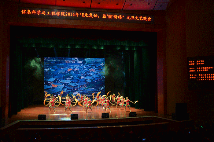 晚会在青春飞扬的爵士舞《Dark horse》中拉开序幕。创意十足的暖场片简要回顾了信息科学与工程学院师生在2015年取得的累累硕果,并向大家送上了2016新年的祝福。接下来,各班级、各艺术团体精心编排的精彩节目炫丽登场:古朴悠扬的舞蹈《古韵》、《茶韵巴山》将大家引入高山流水、婀娜起舞的民族意境;优美动听又发人深思的音乐剧《别爱得太迟》,风趣幽默又意味深长的小品《签约》、《梦想演奏曲》生动诠释了当代大学生追逐梦想的激情和时刻不忘“百善孝为先”的美德;耳熟能详的歌曲串烧《陪你度过漫长岁月》、活力四射的韩舞《Girls Girls Girls》以及学校谷雨乐队带来的歌曲演奏,带领同学们重回那追剧、追星的青涩时光;最后,晚会在欢快喜庆的集体舞《今日苗乡歌最多》中缓缓落下帷幕。晚会现场还布置了微信墙,开设了微信互动抽奖环节,老师、同学们纷纷通过微信传递祝福、分享欢乐。