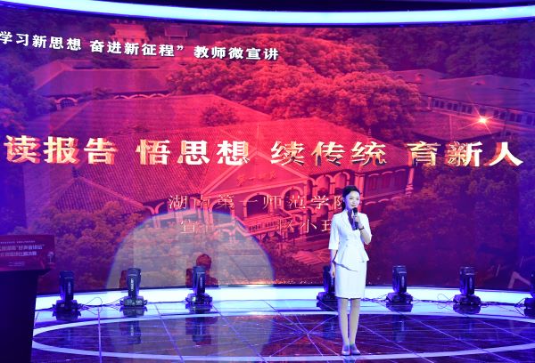 决赛现场,我校赵小玚老师以校友毛泽东在一师求学时所受良师教诲的故事为素材,用最生动的语言深刻宣讲党的二十大精神:“习近平总书记说:‘一个人遇到好老师是人生的幸运,一个学校拥有好老师是学校的光荣,一个民族源源不断涌现出一批又一批好老师则是民族的希望。’今天,作为新时代的人民教师,站在讲台上,我们该承担起什么样的时代大任,又能从先辈们身上得到什么启示呢?”她从“培养什么人、怎样培养人、为谁培养人”三个方面,生动诠释党的二十大对教育工作者的“方向之问”,赢得掌声阵阵。