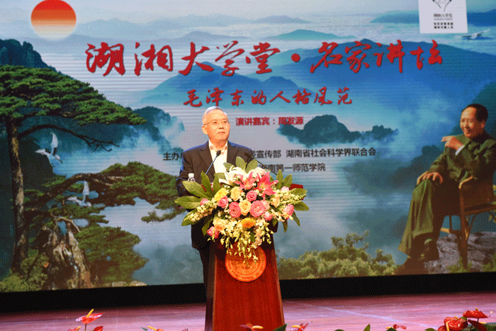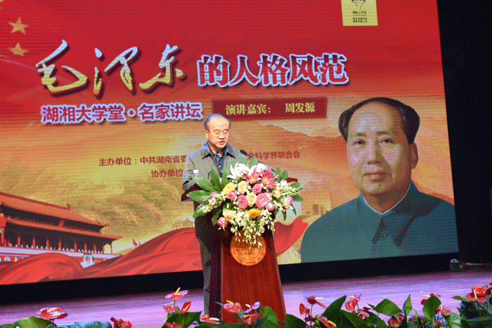 10月27日下午,湖湘大学堂·名家讲坛——“毛泽东的人格风范”演讲活动在我校东方红校区大剧院隆重举行。省人大常委会常委、省社科联党组书记、湖湘大学堂组委会副主任周发源先生担任主讲嘉宾。省社科联党组成员、副主席、湖湘大讲堂组委会副主任黄建华女士,我校领导彭小奇、刘鸿翔、刘志敏、李克勤、刘宇、童小娇应邀出席,湖南省社科界的专家学者、我校师生代表、中央驻湘及省内主要媒体朋友1200余人参加了活动。湖南卫视著名节目主持人李兵担任活动主持。