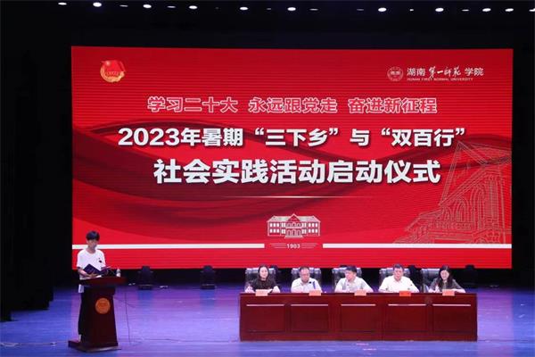 为全面贯彻落实党的二十大精神,深入学习贯彻习近平总书记关于青年工作的重要思想,引导和帮助广大青年学生上好“大思政课”,在社会课堂中“受教育、长才干、做贡献”,6月21日上午,2023年暑期“三下乡”与“双百行”社会实践活动启动仪式在我校东方红校区田汉剧场举行。校党委书记罗成翼,党委副书记、校长胡穗,党委委员、副校长蒋蓉出席启动仪式。贵州茅台酒销售有限公司、贵州茅台湖南省经销商联谊会,校团委、学生工作部、招生就业处等部门负责人,各二级学院党委书记、副书记、分团委书记代表,“三下乡”与“双百行”团队指导老师及600余名学生代表参加启动仪式。仪式由蒋蓉主持。