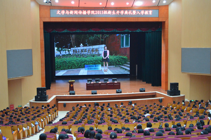 秋风送爽,丹桂飘香。9月13日下午,文学与新闻传播学院2015级新生开学典礼在音乐楼大剧院隆重举行。学院院长刘澍心、党总支书记林光明、副院长龙永干、师生代表及新生近600余人出席典礼。典礼由院党总支副书记陈天涯主持。