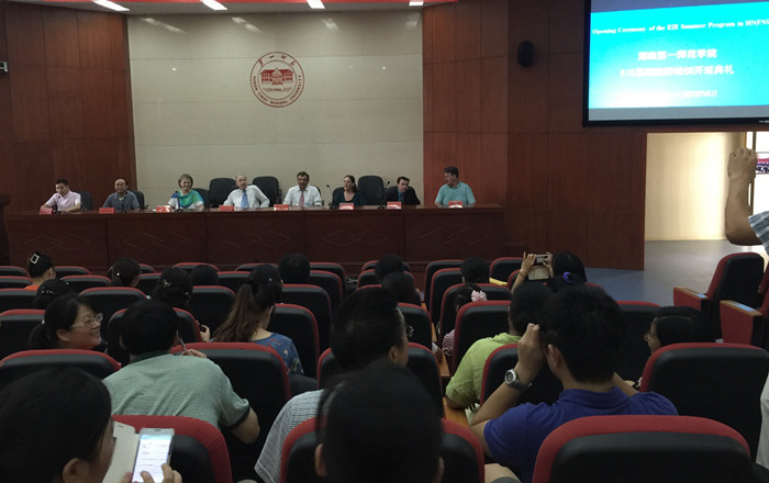 7月20日上午,我校2015年暑期英语教师培训项目开班典礼在科技楼视频会议室隆重举行。副校长刘鸿翔、国际交流与合作处处长刘明东、人事处副处长文小妮出席了开班典礼。来自美国、英国、澳大利亚的6位外籍教师以及我校40名学员参加了开班典礼。开班典礼由刘明东教授主持。