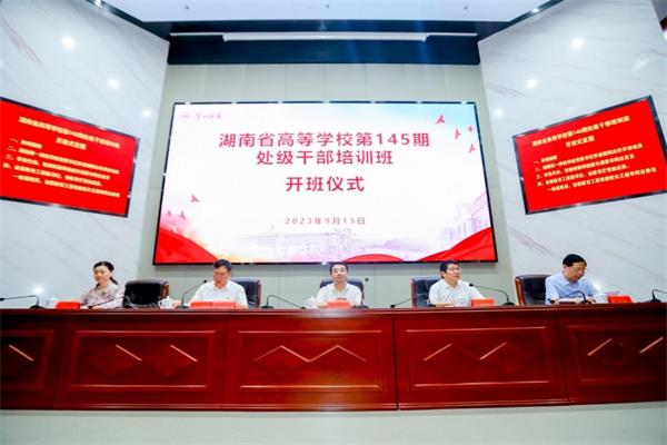 9月15日,湖南省高等学校第145期处级干部培训班在我校顺利开班,湖南省委教育工委副书记、教育工委党校校长王建华,我校党委书记罗成翼,湖南省高校干部培训中心副主任刘健出席开班仪式。开班仪式由我校校长胡穗主持。