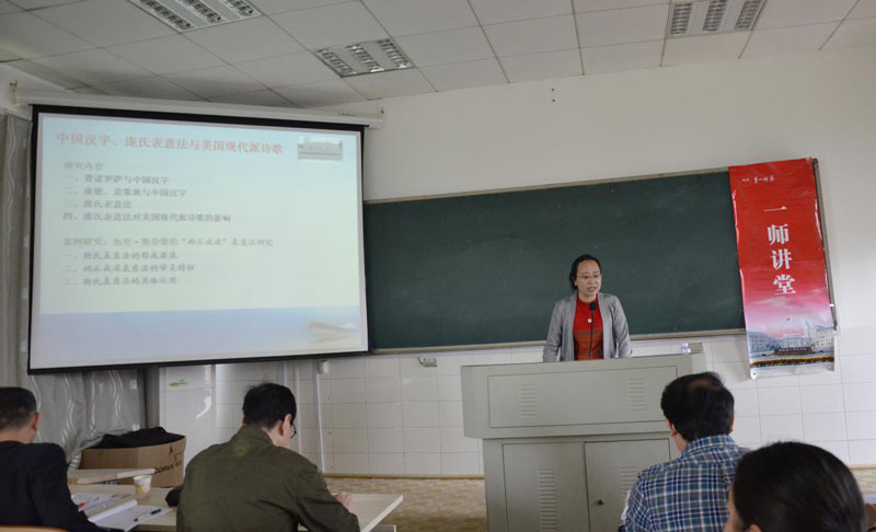 5月12日下午,湖南大学外国语学院副院长、博士生导师谭琼琳教授应邀到我校“一师讲坛”作学术讲座。讲座题目为:“中国汉字、庞氏表意法及美国现代派诗歌”。讲座由外国语学院刘祥清院长主持,康响英教授进行了总结发言。