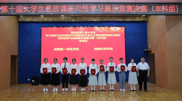 6月1日,湖南省第十届大学生学习贯彻习近平新时代中国特色社会主义思想暨思想政治理论课研究性学习成果展示竞赛决赛(本科组)在湖南工业大学举行,由马克思主义学院2022级思政1班毛阳慧、杨鑫如、庄倩仪、陈潭雨、喻佳鹏五位同学组成的研究性学习小组,其汇报作品《以全人类共同价值引领新时代青年共建人类命运共同体》以小组第一的成绩荣获本科组特等奖。除特等奖外,我校此次研究性学习竞赛还获得二等奖4项,三等奖2项,获奖等级和数量均名列我省高校前列。