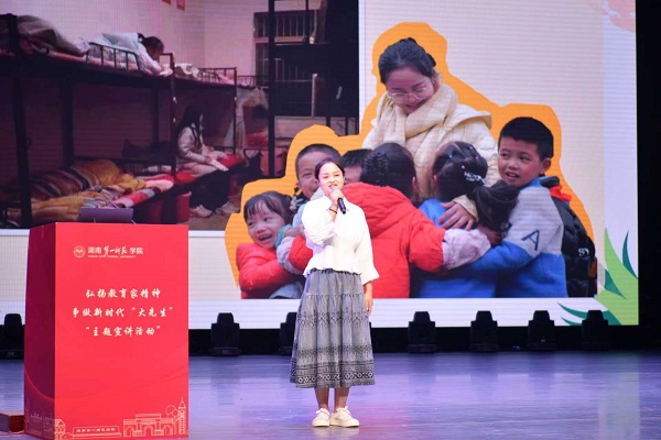 全国优秀教师、全国乡村优秀青年教师、郴州市桂阳县荷叶镇中心学校党支部书记郭泽宇,以“以梦为马,争做新时代的人民教育家”为主题,分享了自己对人民教育家的理解与志向,介绍了大学期间修学储能以及走上工作岗位后坚定理想信念、用爱帮扶感化学生、用心务实创新的故事。