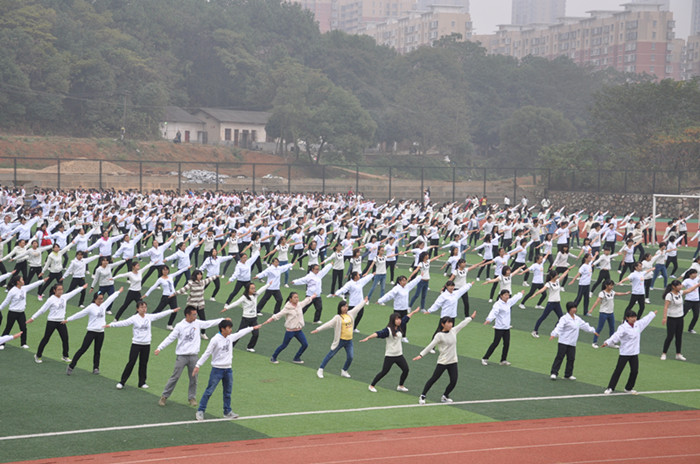 现在流行的广场舞,音乐大多为流行乐、网络歌曲、口水歌,在旁人听来,声音聒噪俗气,也由于这个原因总引发了一些扰民的纠纷与矛盾。而现在改编的《毛氏六段操》,是以第一师范的校歌为背景音乐,让我校学生合着自己的节奏,在自己学校的广场上,斗志昂扬地跳着属于我校文化传统的优秀项目,深化了校本课程的实质性内涵,能多层次满足社会发展和学生需求。“衡山西,岳麓东,城南讲学峙其中······学子努力蔚为万夫雄!” 这样的音乐,这样的舞姿,这样的搭配,无一不展现出我校学生青春焕发,风华正茂之气概。