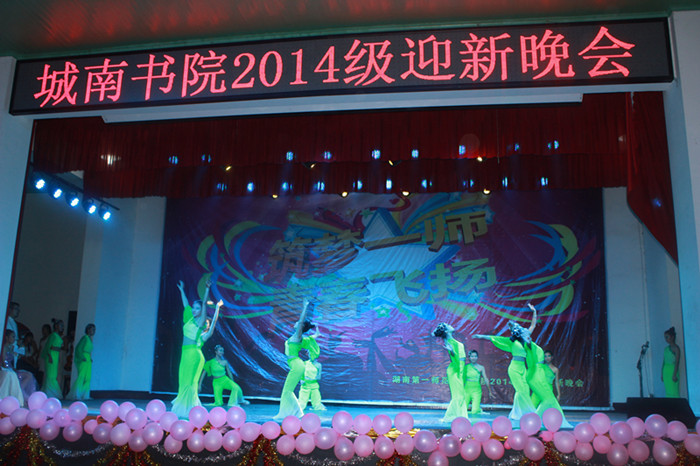 10月26日城南书院2014级迎新晚会“筑梦一师,青春飞扬”在大礼堂隆重举行。校党委书记彭小奇、校长肖湘愚、副校长童小娇、校长助理、校党政办主任江正云、文学院院长刘澍心、教育科学院党总支副书记谭玉兰、体育学院副院长朱建伟以及城南书院党政负责人应邀观看了晚会。