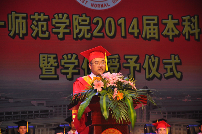校党委书记彭小奇教授代表学校致贺辞《燃烧吧,青春!》,祝贺同学们顺利毕业。他说,四年时光转瞬即逝,大家即将告别自己的本科时代,告别这段难以割舍的青春岁月。相信同学们一定能记住自己的老师、自己的同学、自己的朋友,也相信同学们一定能记住学校的教室、操场、寝室,记住在学校经历的点点滴滴。正是这些,陪伴大家走过了这段美好时光,培育了大家对未来人生的梦想。一师是我们孕育梦想的地方、一师是我们梦想起航的地方、一师也是我们成就梦想的地方。他希望从一师走出去的每位同学,能以扎实的知识和出色的能力,能以博大的胸怀和包容的精神,传承一师气质,肩负社会责任,让梦想的翅膀,为祖国和社会增添更多的正能量!他最后表示,母校将永远是同学们温暖的家,母校将永远支持你们!彭书记的致辞结束后,全场报以热烈的掌声,表达了同学们心中对母校的深厚感情和对学校领导谆谆话语的强烈共鸣。