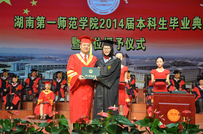 伴着热烈而欢快的背景音乐,校长肖湘愚教授为获得学位的毕业生一一授予学位,拨正流苏,握手祝福并合影留念。