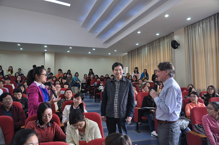 第二场讲座中,Mark教授剖析了被动学习与主动学习,介绍了为学而教的教学方式,探讨了有效的课堂教学策略,并通过案例呈现了有效的阅读与写作课堂教学的设计与组织。讲座中,他反复强调了有效课堂教学组织的三个关键词:积极(Activeness)、创新(Creativeness)、有效(Effectiveness)。