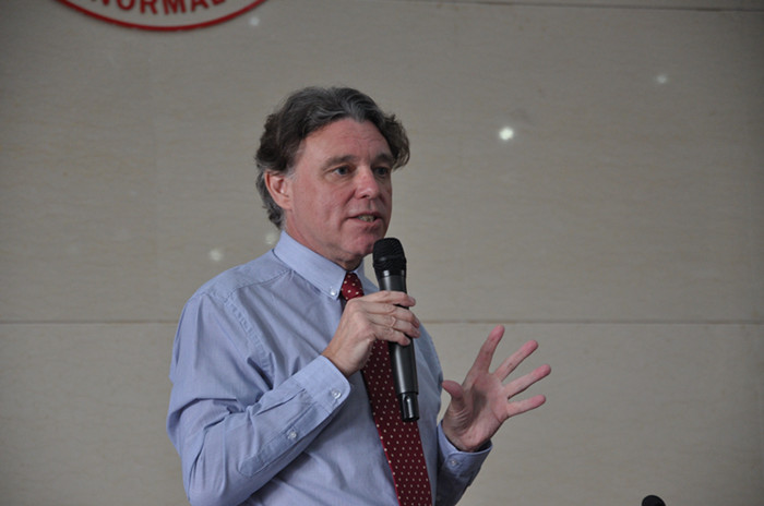 第一场讲座中,Mark教授以英国知山大学(Edge Hill University)为例,分析了高等教育国际化的目的意义、方式方法,探讨了高等教育国际化教学过程中存在的问题及其对策,展望了高等教育国际化的发展前景,并就如何顺应高等教育国际化的发展趋势提出了建议。在讲座中,他反复强调了高等教育国际化的三个关键词:高的质量(High Quality)、好的体验(Good Experience)、美的声誉(Nice Reputation)。