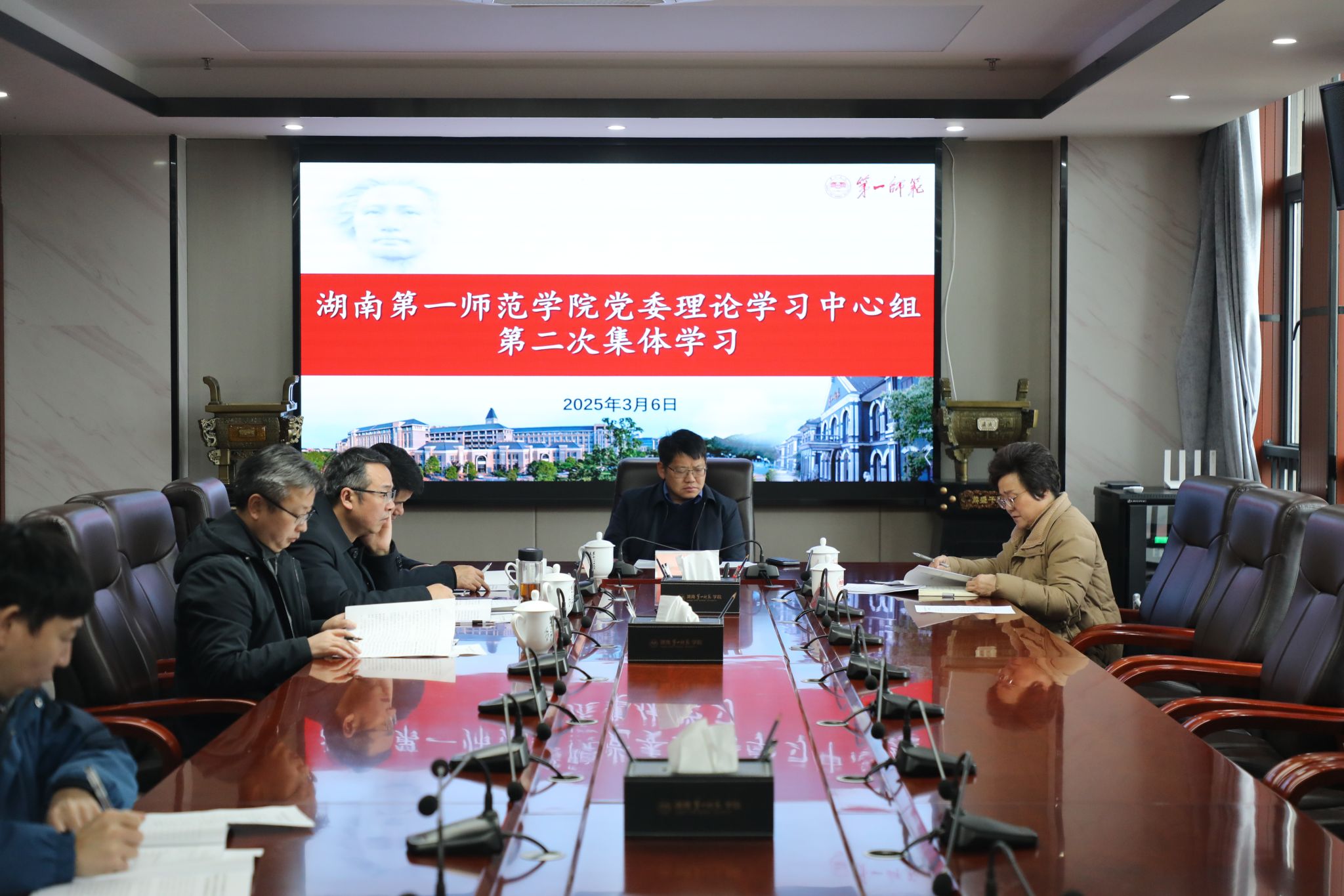 会上,党委委员、副校长周发明领学习近平总书记在中共中央政治局第十九次集体学习时的重要讲话;党委委员、纪委书记李昱领学习近平总书记在二十届中央纪律委员会第四次全体会议上的重要讲话;党委委员、副校长彭晓辉领学第二十八次全国高校党的建设工作会议精神;副校长石元泉传达《中共湖南省委教育工作领导小组秘书组关于认真学习贯彻全省教育大会精神的通知》。