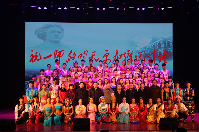 随后,由我校师生自编自导自演的文艺演出拉开序幕。音乐系的合唱《沁园春·长沙》和舞蹈《风华正茂》,再现了毛主席当年在一师学习时风华正茂、挥斥方遒的豪迈气概,也寄托了一师人对伟大领袖的深切怀念。一师附小的小朋友们为观众表演的管弦乐合奏《闪闪的红星》,向观众表达了青少年对革命精神的理解和传承。教科系以“最美乡村教师”吴金城为原型创作的情景剧《守望》,在这个寒冷的冬季带给了现场观众满满的感动与温暖。灵动的十指在黑白琴键上舞蹈,音乐系教师樊小欢演奏的钢琴曲《山丹丹花开红艳艳》将我们带回到陕北延安抗战时期的光辉岁月。在热烈地欢呼声中,体育系的啦啦操《舞动青春》彰显了当代大学生的青春活力。最后,在大型舞蹈《锦绣中华》欢乐、祝福的舞姿中,联欢会圆满落下了帷幕。