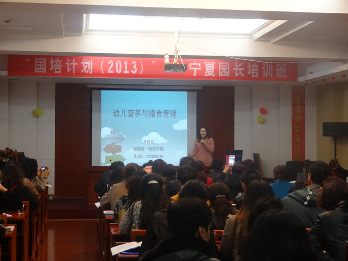 这是我校第一次承担国培计划宁夏项目。此次培训主要围绕学前教育法规政策、幼儿园教育教学改革、现代教育管理理论和幼儿园管理实务等课程模块展开。培训采取专题学习与案例研讨相结合、集体讲座和小组研讨相结合、同行交流和专家引领相结合等方式,将参与式、团队化的培训理念贯穿于培训的全过程。培训中,邀请到省内外的学前教育专家,如南京师范大学教授黄进,广东省幼儿园园长培训中心副主任、特级教师王明晖,南京市第一幼儿园副园长、特级教师周联,深圳市龙岗区教育局幼教教研员、特级教师张静等为学员们授课。
