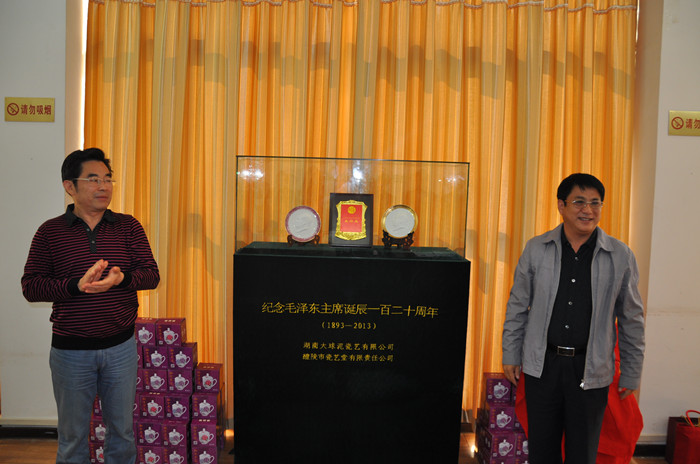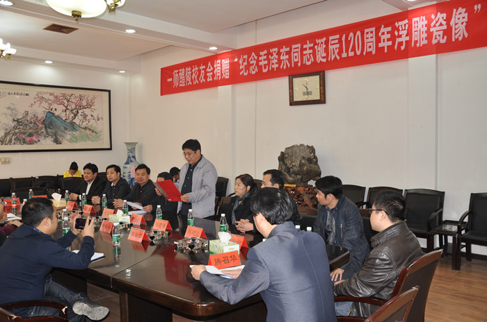 捐赠仪式上,醴陵校友会会长黄科云发表了饱含真情的致辞。他说:母校群星灿烂,名人辈出,深以为傲。一代伟人毛泽东在此求学、工作八个春秋,立下了解放和振兴中华民族之志。历届一师学子沐浴母校师恩,受惠终身。此次捐赠“纪念毛泽东主席诞辰120周年浮雕瓷像”等醴瓷珍品,就是想表达对一代伟人以及母校的怀念与敬仰。
