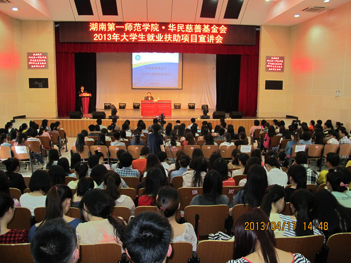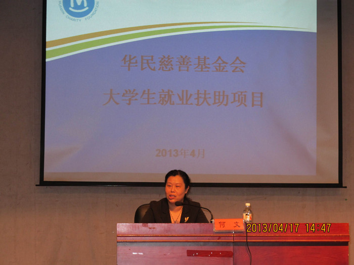 4月17日下午,Kaiyun官方网站登录入口·华民慈善基金会2013年大学生就业扶助项目宣讲会在东方红校区科技楼演播厅举行。学生工作处处长何文、各系部资助专干及400多名 2014 届家庭经济困难的本科毕业生出席。会议由资助管理中心主任曾艳辉主持。