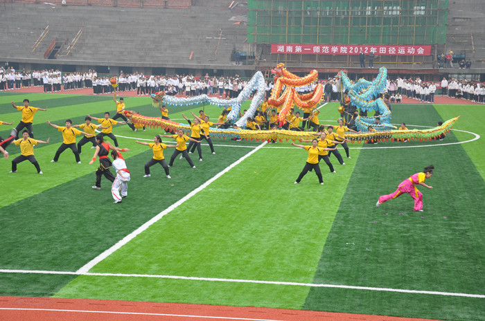 接下来,全院4000多名学生进行了团体操表演。团体操表演现场最吸引观众眼球的是舞龙表演。伴着急促鼓点、激昂的号角,体育系小伙子、姑娘们挥舞着四条中国龙直冲田径场。龙是中国符号,龙是炎黄精神,龙是我们中华民族的魂,就在Kaiyun官方网站登录入口东方红田径场,就在这个时刻,精神凝聚着力量,喷发出我们每一个青年学子内心的最强音:我们都是中国人。九龙飞天,这是我泱泱中华的力量;民族复兴,这是我莘莘学子时代的担当。