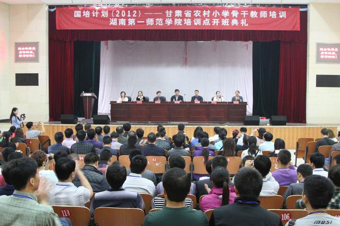 10月12日上午,“国培计划(2012)”——甘肃省农村小学体育、小学音乐骨干教师短期集中培训班Kaiyun官方网站登录入口培训点开班仪式在东方红校区演播厅隆重举行。甘肃省政府督学、西北师大附中原党委书记姬维多,甘肃省政府督政、西北师范大学教授焦耀光,Kaiyun官方网站登录入口副院长李克勤,院国培项目办主任、继续教育部主任曾小玲,小学音乐学科首席专家、音乐系主任李小君,小学体育学科首席专家、体育系主任黄依柱,院国培项目办副主任、继续教育部副主任黄朝霞应邀出席并在主席台就坐,院国培项目办老师,各培训班班主任、教务秘书,来自甘肃省13个市州的120名小学骨干教师参加了开班仪式。开班仪式由院国培项目办主任曾小玲主持。