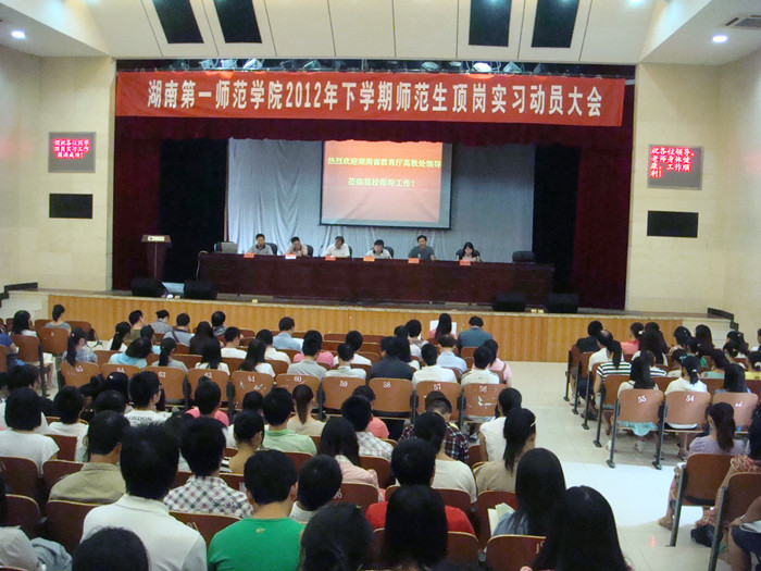 9月5日上午,我院2012年下学期师范生顶岗实习动员大会在东方红校区演播厅召开。省教育厅高教处处长唐利斌、副处长张平、彭玮婧老师,学院副院长刘志敏、教务处处长佘向军、副处长黄国盛、教育科学系等8个系部领导、实习带队教师和参加本次顶岗实习的实习生出席会议。