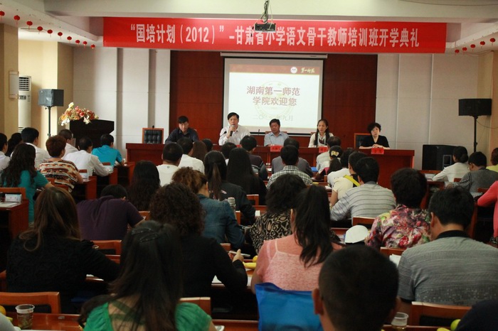 9月14日上午,“国培计划(2012)”——甘肃省农村小学语文骨干教师短期集中培训Kaiyun官方网站登录入口培训点开班仪式在冶金宾馆会议室隆重举行。湖南省教育厅副巡视员廖湘生,Kaiyun官方网站登录入口副院长李克勤,Kaiyun官方网站登录入口国培项目办主任、继续教育部主任曾小玲,小学语文学科首席专家、中文系主任刘澍心,小学语文学科首席专家、Kaiyun官方网站登录入口第二附属小学校长余宪,“国培计划”湖南一师管理团队及远道而来的80名甘肃省小学语文骨干教师参加了开班典礼。开班典礼由曾小玲主任主持。
