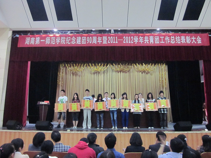 院党委宣传部部长陈志武宣读了《关于表彰2011—2012学年先进团组织和优秀个人的决定》,各位领导为先进集体和优秀个人颁发了奖状和荣誉证书,获奖代表数理系成夏炎老师、外语系周燚同学发表了获奖感言。