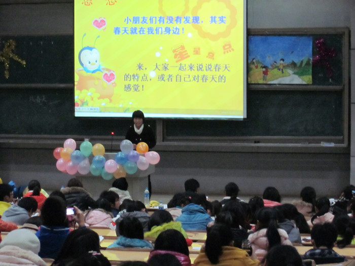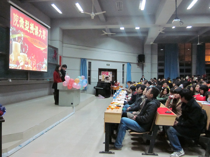 12月8日晚,我院2011年下学期大学生微型课授课大赛决赛在东方红校区理科楼报告厅举行。院团委任晓晴书记、罗祥云副书记、杜毅老师应邀出席;教科系邓素文老师、朱阿芳老师、石慧老师,文史系张俨老师,数理系成夏炎老师,信工系李豪杰老师,以及正在我院进修的“国培”语文班学员潘英老师、王丽老师担任评委,全院400余名同学观看了比赛。