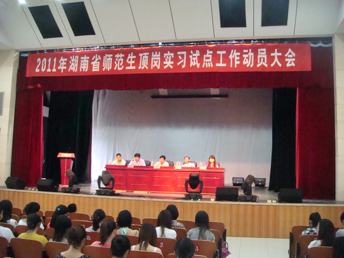 根据省教育厅的指示精神,我院在认真总结2008年以来师范生顶岗实习工作经验的基础上,决定继续开展师范生顶岗实习工作。8月27日上午9:00,我院2011年师范生顶岗实习动员大会在东方红校区科技楼演播厅隆重召开。省教育厅高教处唐利斌处长、彭玮婧老师,我院刘志敏副院长,教务处陈梦稀处长、朱承学副处长应邀出席了会议。