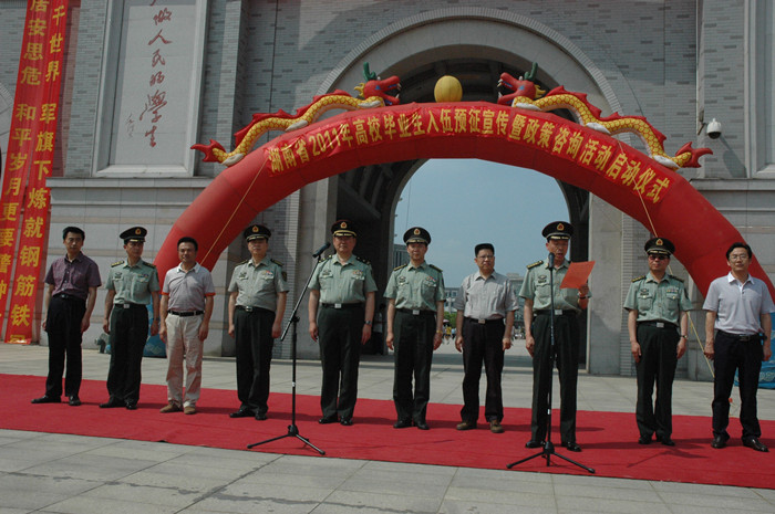 5月9日上午,湖南省2011年高校毕业生入伍预征宣传暨政策咨询活动启动仪式在我院东方红校区举行。省军区司令员张永大少将、副参谋长程佐胜、政治部主任胡鹏飞,省教育厅副巡视员陈飞跃,我院党委书记詹小平出席启动仪式。仪式由长沙市警备区司令员李田贵主持。