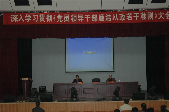 大会由我院纪委书记阳柏苏主持。全体与会人员认真观看了《中国共产党党员领导干部廉洁从政若干准则》辅导讲座录像。