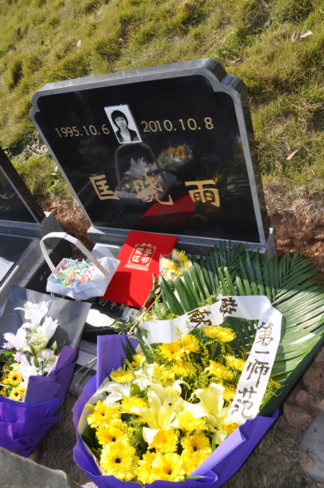 花蕊飘落,烛光摇曳。晓雨的家人、老师和同学以及省红十字会、省卫生厅、湘雅医学院等单位的领导依次献上纯洁的菊花,在晓雨的墓前和她做最后的告别……