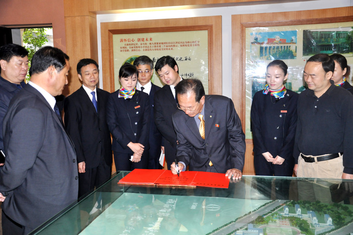 最后,参观团团长赵成杰挥笔留言:毛泽东主席的伟大革命业绩代代相传!(翻译大意)刘鸿翔副院长将毛泽东当年求学一师时的资料汇编赠送给友人并合影留念。