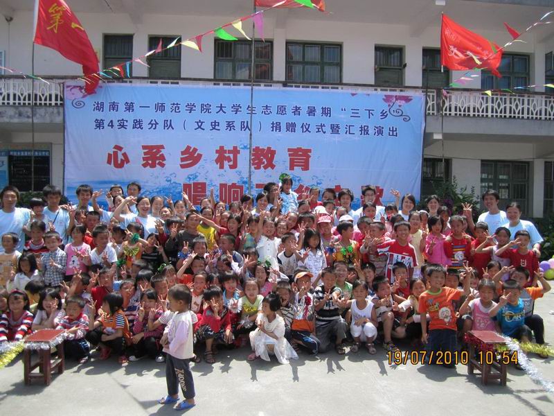 7月19日上午,我院大学生志愿者暑期“三下乡”社会实践文史系分队在郴州市桂东县新坊乡溪源小学举行以“心系乡村教育,唱响下乡之歌”为主题的捐赠仪式暨汇报演出。桂东县委宣传部陈应时副部长、团县委郭昕书记、新坊乡党政领导、溪源村领导及学生家长和群众近400人出席捐赠仪式并观看了演出。